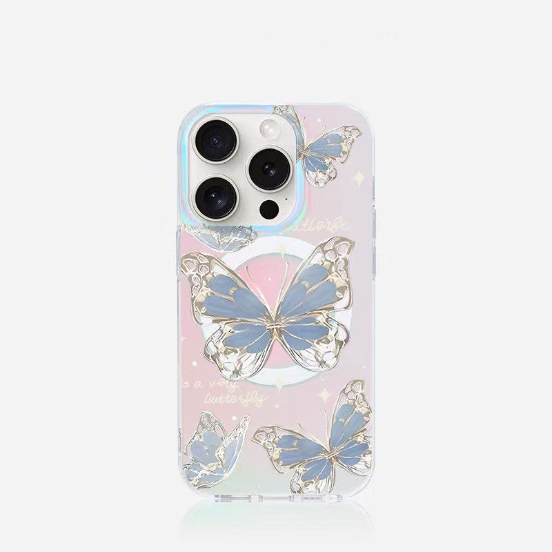 スマホケース レーザーカラー ブルー & ゴールドバタフライ柄マグネットスマホケース 耐衝撃・防振性能に優れ、高級感あふれるスマホケースで、iPhone 11~17 に対応