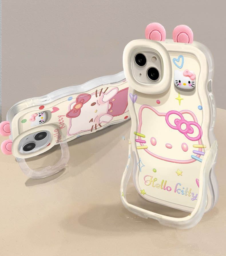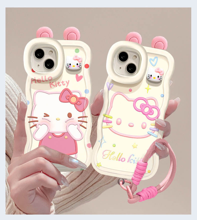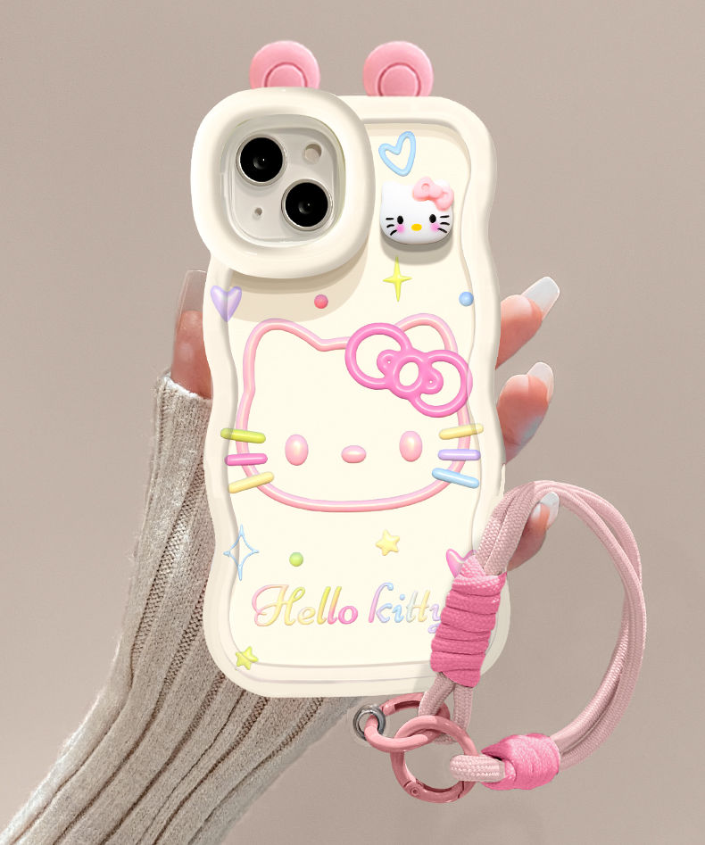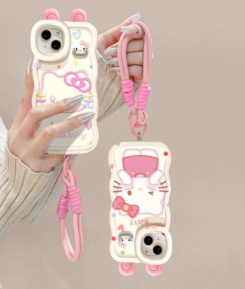 萌える要素がたっぷりのハローキティスマホケースが登場!ケースには立体的なハローキティのぬいぐるみや、揺れる耳が付いており、いつ見ても可愛らしさに癒されます。つるし紐が付いているので、携帯が便利です。