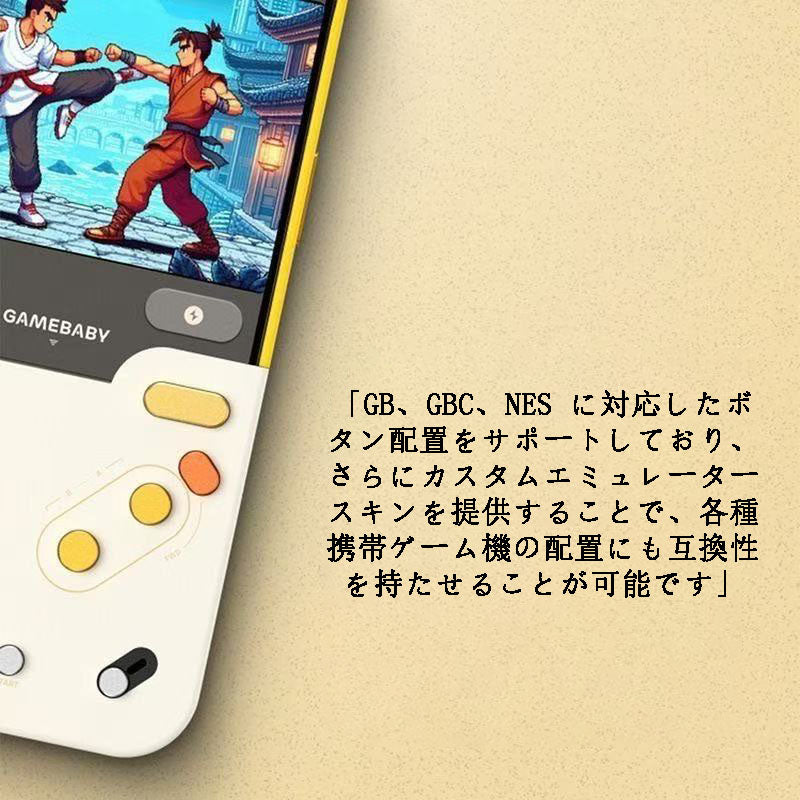 GB、GBC、NES に対応したクラシックなボタン配置をサポートし、カスタムエミュレータースキンで各種携帯ゲーム機にも互換性を持たせられます。配線不要、充電不要、Bluetooth 不要で、いつでも始められて何の心配もなく、レトロな思い出とゲームの活力を満喫できます