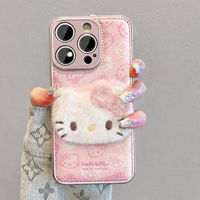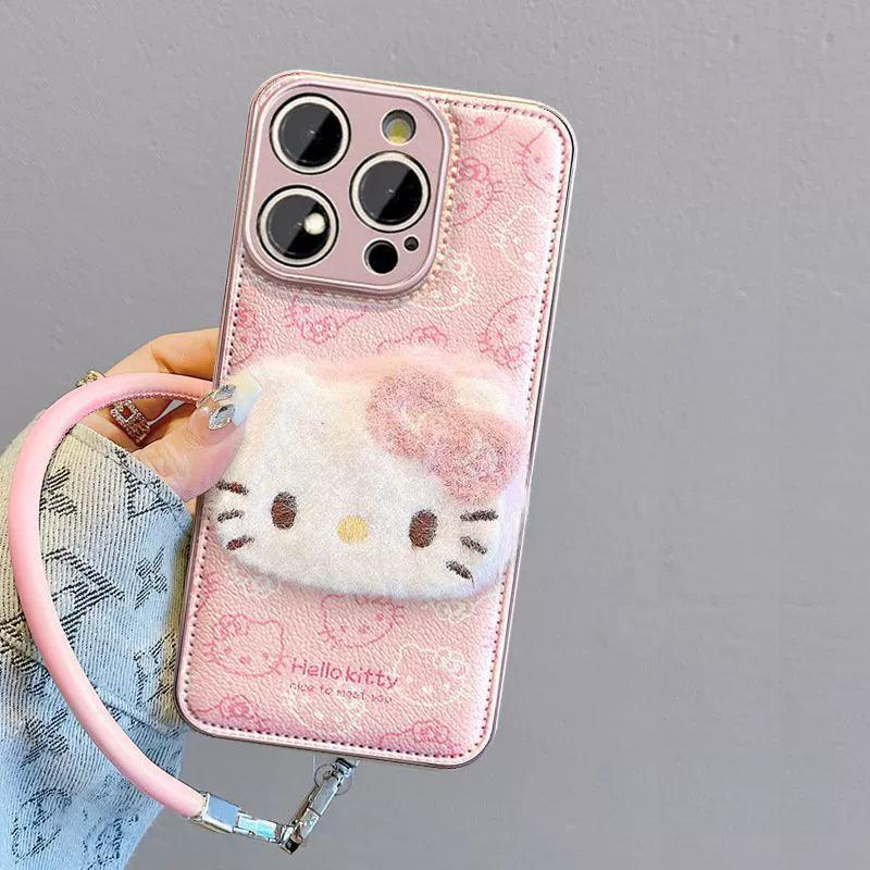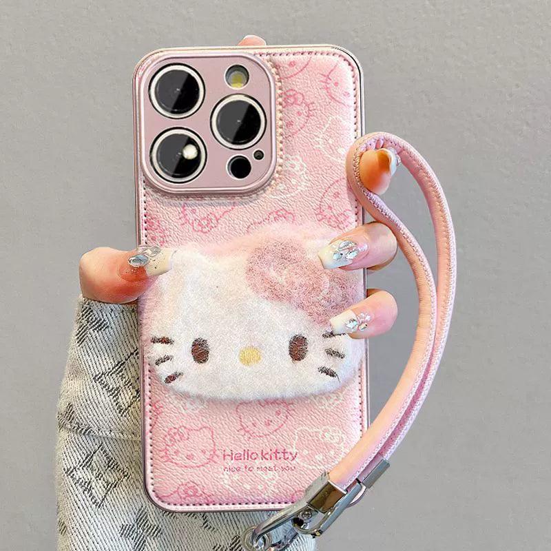 立体のぬいぐるみ風 Hello Kitty デザイン 高級感あふれる 紐付き スマホケース iPhone に対応