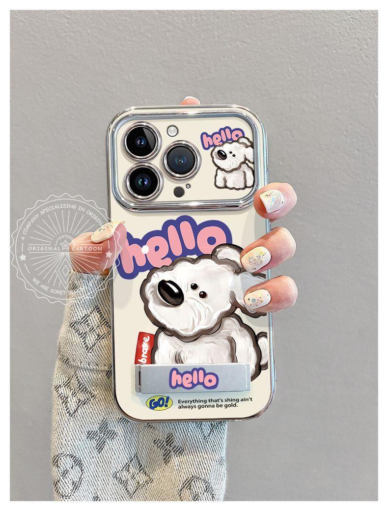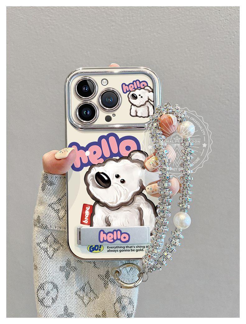 頭を傾けた子犬 デザイン 高級感あふれる ブレスレット兼スタンド付き スマホケース、iPhone に対応
