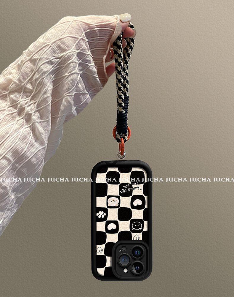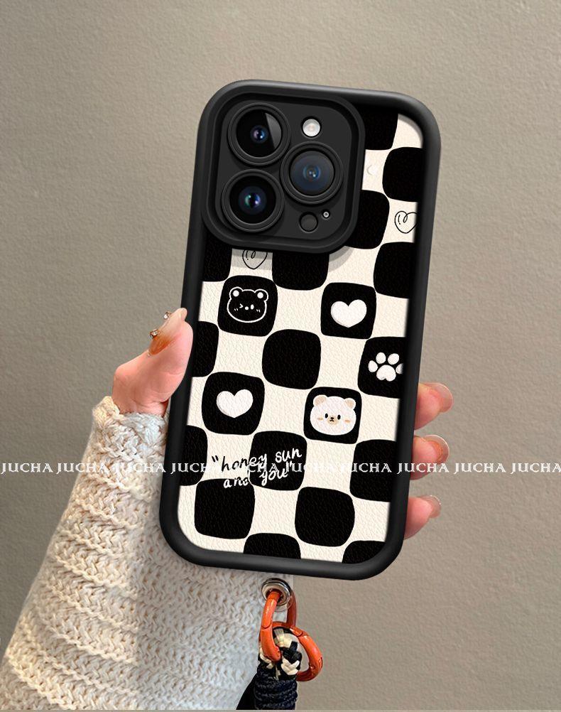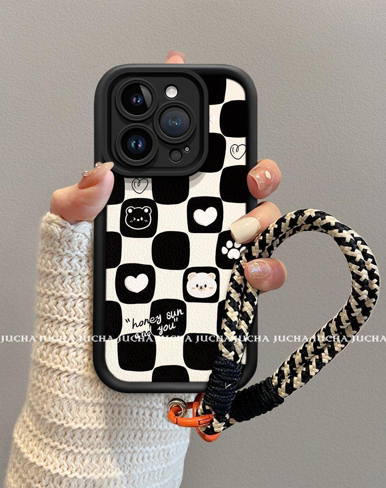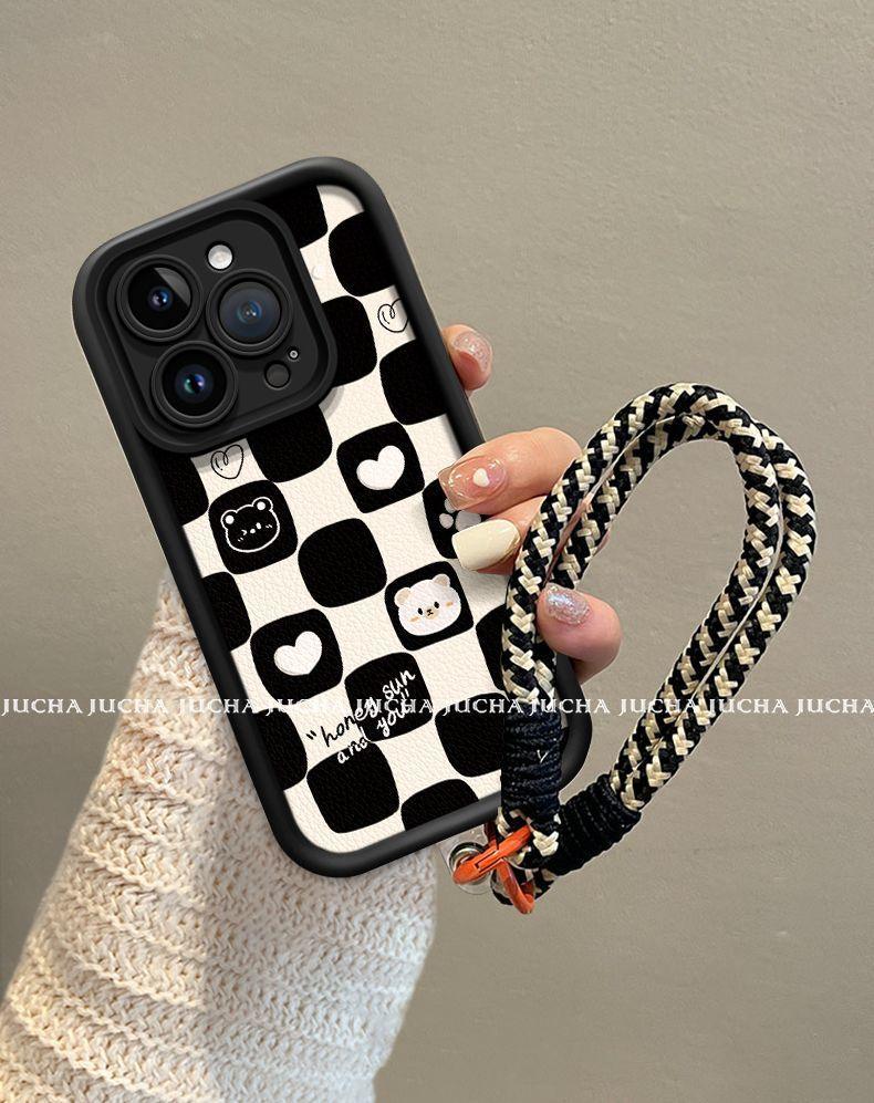 白黒のハートを持つクマ デザイン 、耐衝撃・防振性能に優れ、高級感あふれる紐付きスマホケースで、iPhone に対応