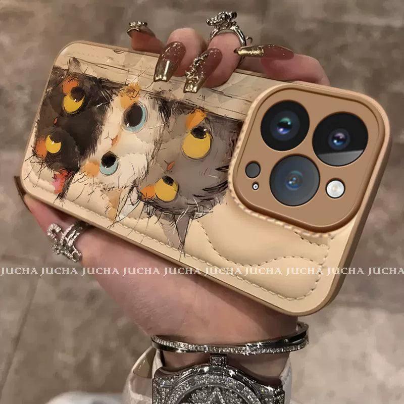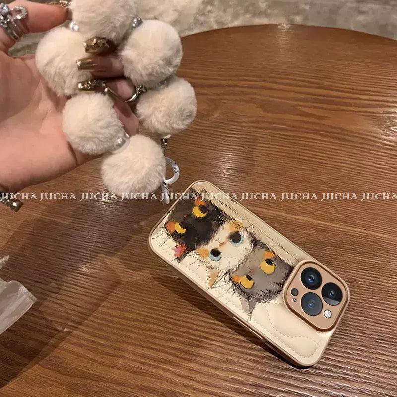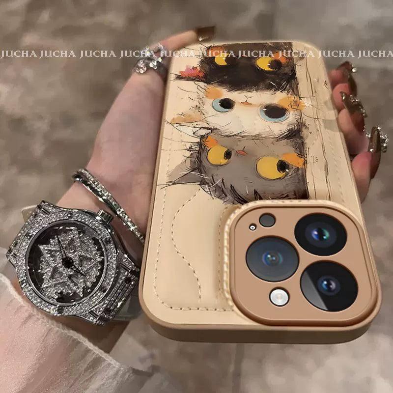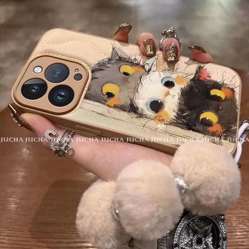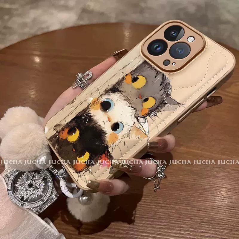 顔を出して可愛らしい猫 デザイン 、耐衝撃・防振性能に優れ、高級感あふれる紐付きスマホケースで、iPhone に対応