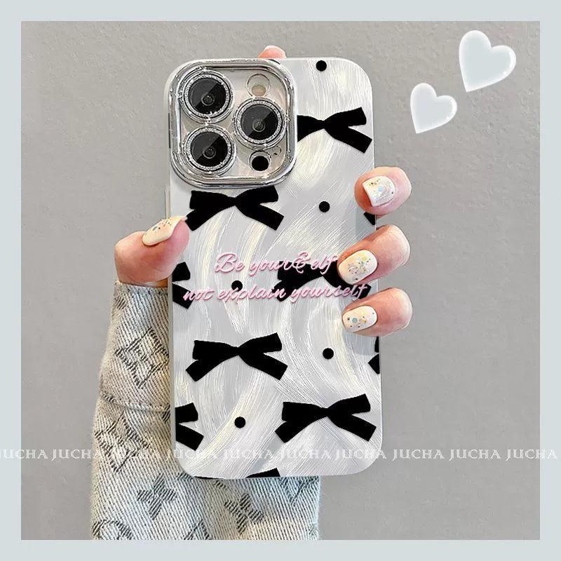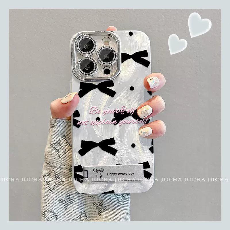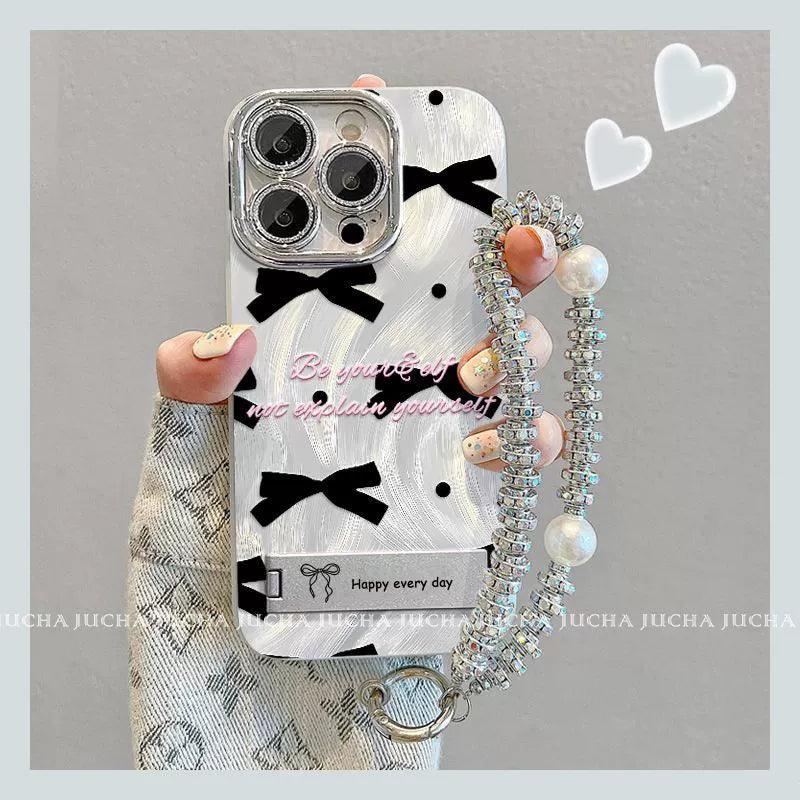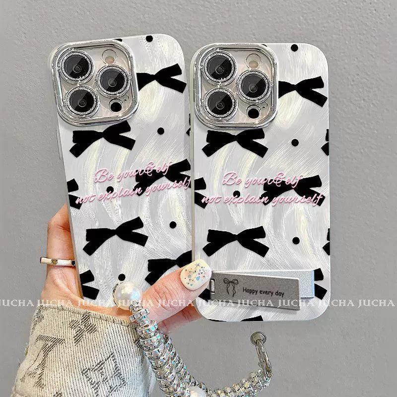 黒色のボウタイ デザイン 、スマホケース 耐衝撃・防振性能に優れ、高級感あふれる紐付きスタンド付きスマホケースで、iPhone に対応