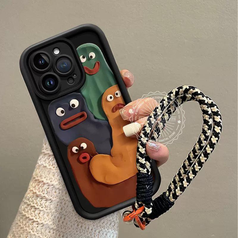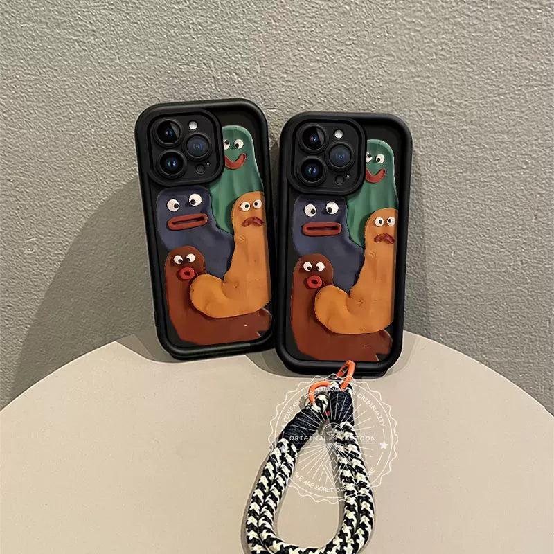 4匹の目を見開いた虫のデザイン 高級感あふれる 紐付き スマホケース iPhone に対応