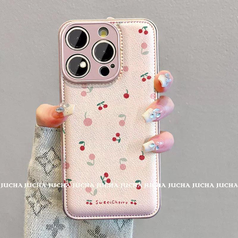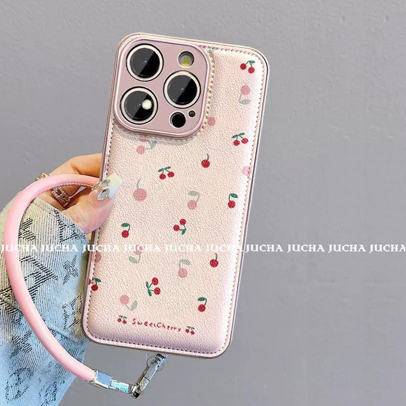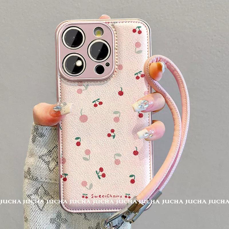 小さな桜桃のデザイン 高級感あふれる 紐付き スマホケース iPhone に対応