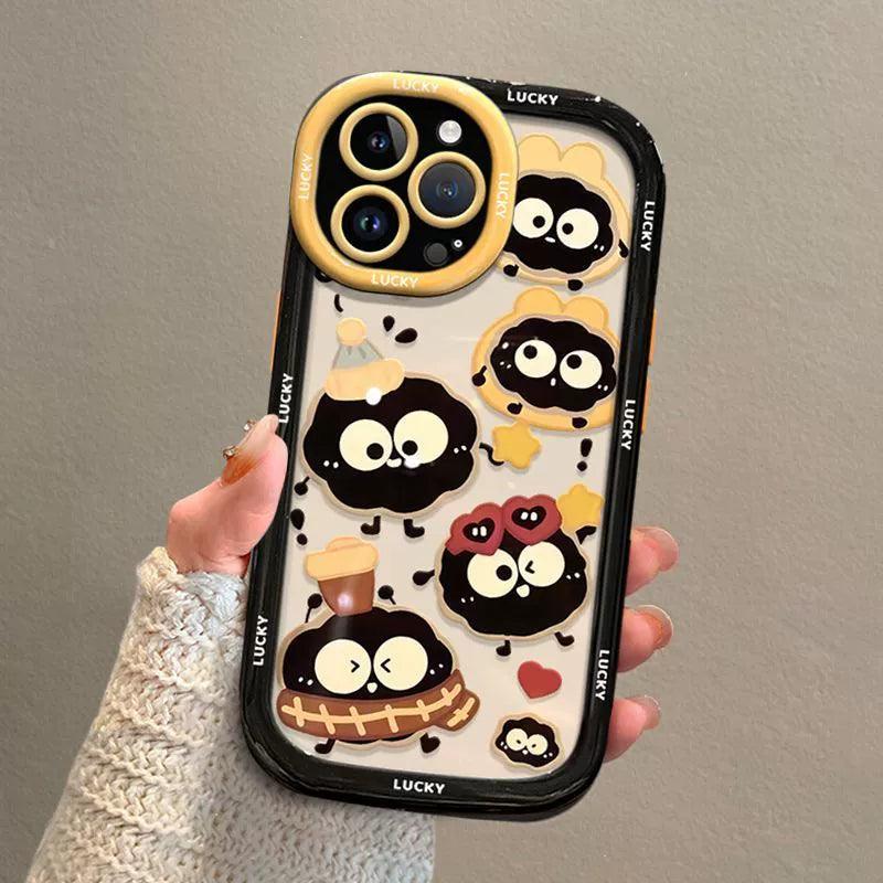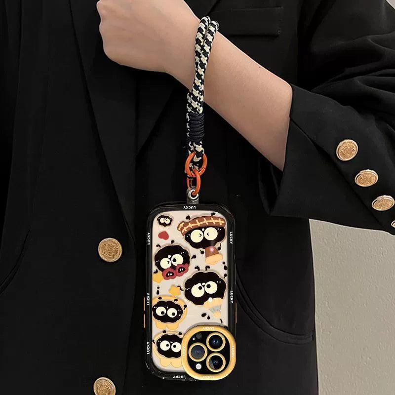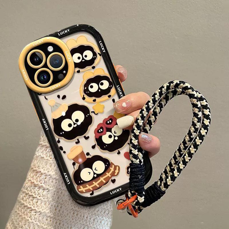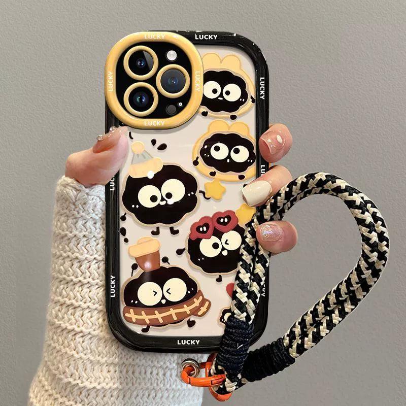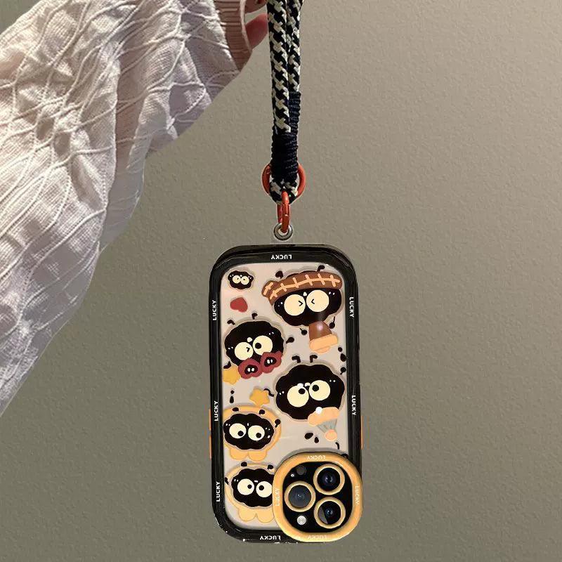 幸運を招く煤球をデザインに取り入れた 高級感あふれる 紐付きスマホケース iPhone に対応
