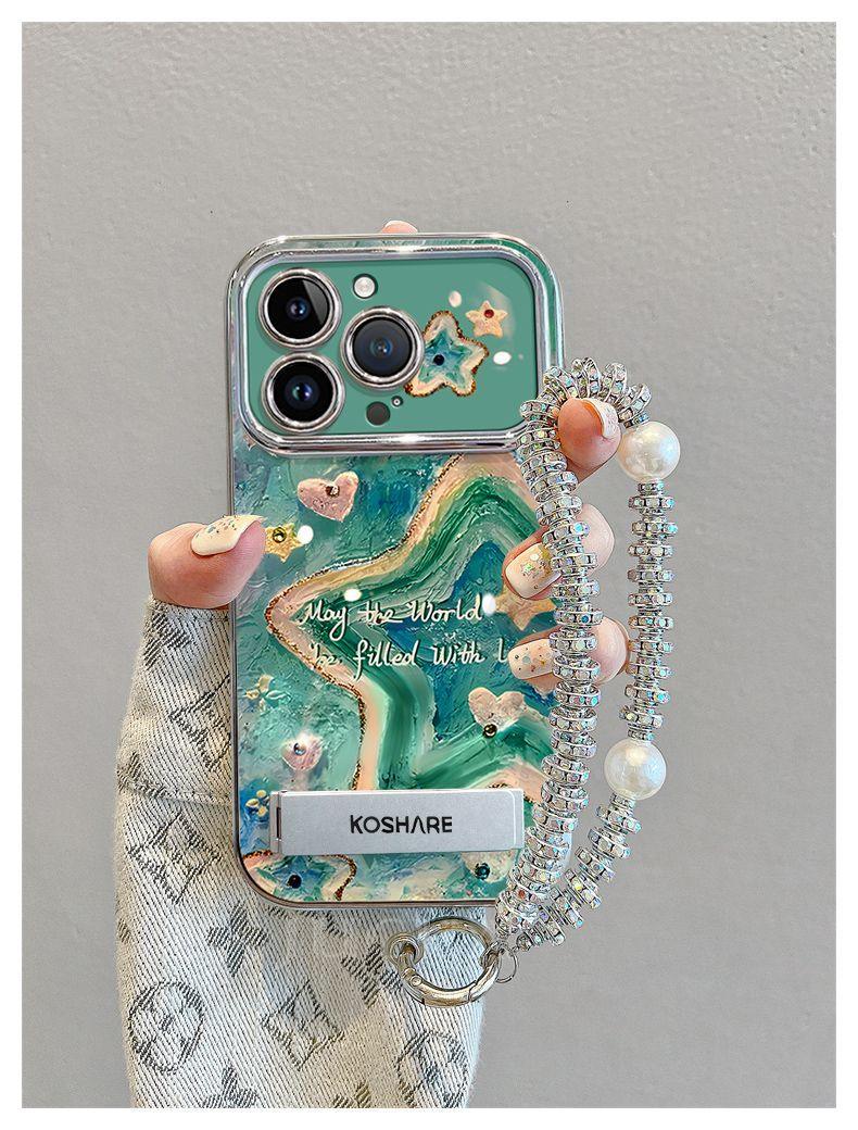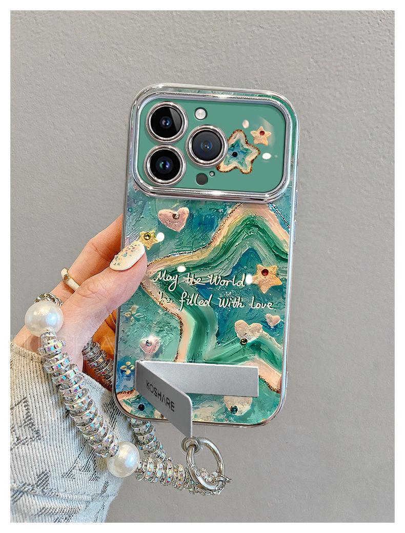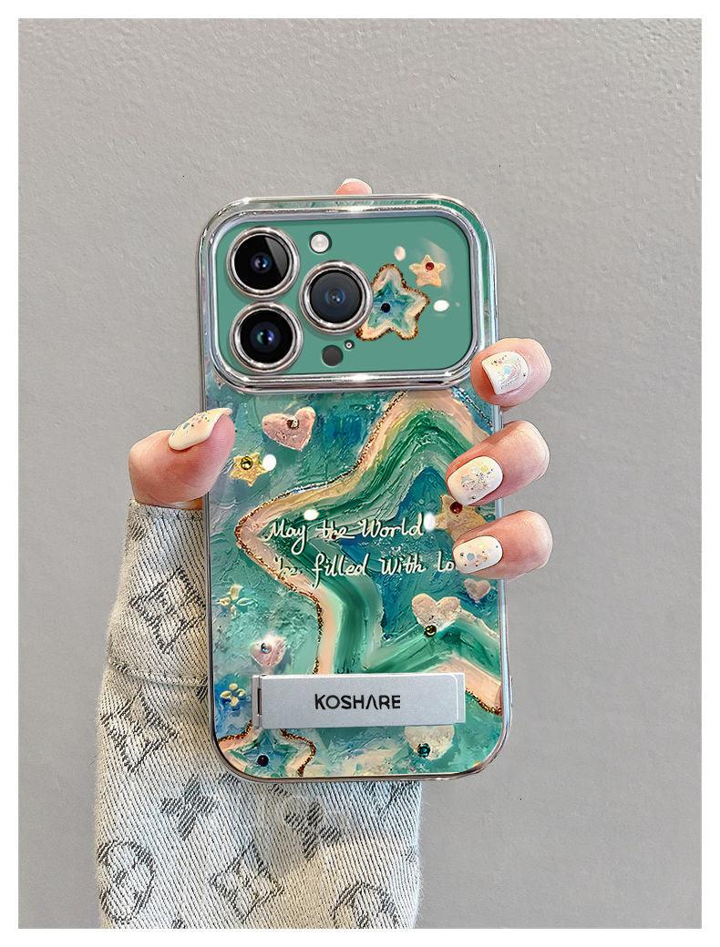 油絵風の海星デザイン 高級感 あふれる 紐付き スタンド付き スマホケース iPhone に対応